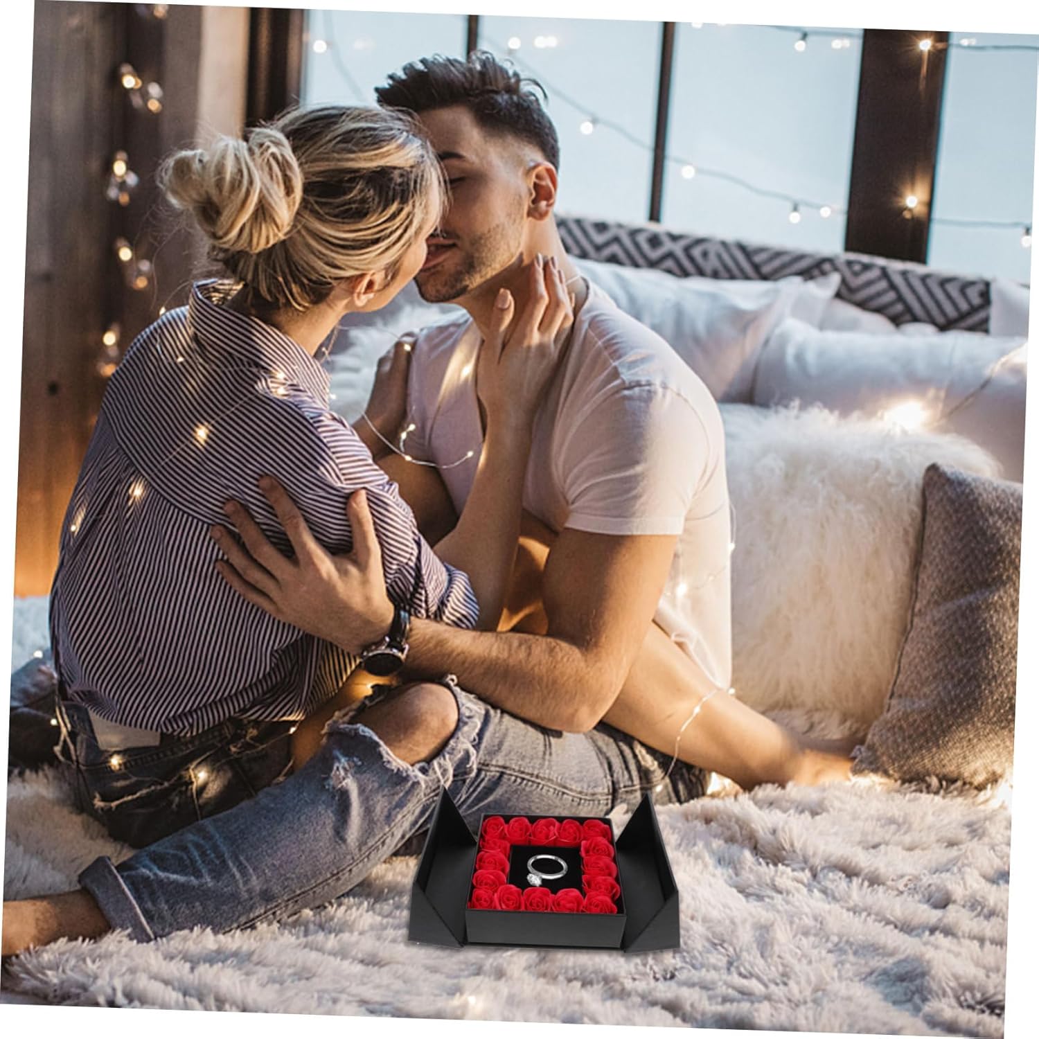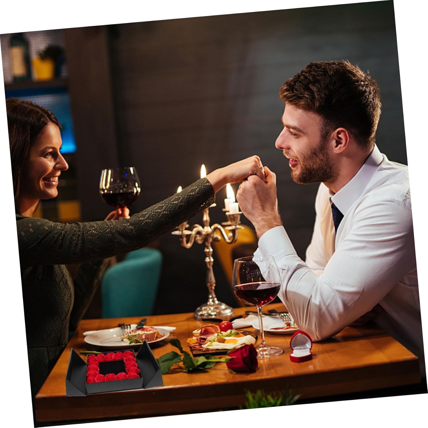 Además, su compartimento interior permite guardar pequeñas joyas como anillos, collares o pulseras, convirtiéndola en una opción perfecta para momentos románticos o propuestas especiales.